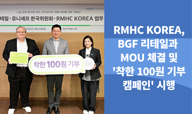BGF리테일과 RMHC Korea가 함께하는 따뜻한 나눔이 시작되었습니다. BGF리테일와 RMHC Korea는 MOU를 체결하며, CU에서 결제 시 100원을 기부할 수 있는 ‘착한 100원 기부 캠페인’을 진행하게 되었습니다. 더 많은 이야기는 RMHC Korea 공식 인스타그램에서 확인해보세요. 바로가기(<-클릭)