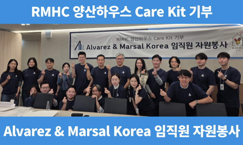 Alvarez & Marsal Korea 임직원분들이 RMHC 양산하우스 가족들을 위해 직접 Care Kit을 제작했습니다. Care Kit는 양산하우스에 머무는 중증 환아 가족의 하우스 생활을 돕는 선물 상자입니다. 더 많은 이야기는 RMHC Korea 공식 인스타그램에서 확인해보세요. 바로가기(<-클릭)